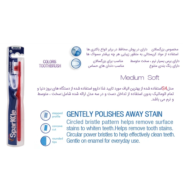 مسواک اسپارکل مدل S4 با برس متوسط انتخابی مناسب برای پاکسازی مؤثر دندانها و حفظ سلامت لثه است. الیاف باکیفیت این مسواک به حذف پلاکهای دندانی کمک کرده و بدون آسیب به لثه، حس تمیزی و تازگی ایجاد میکند. این محصول در بسته 3 عددی و با رنگ سبز عرضه میشود و گزینهای اقتصادی برای مصرف روزانه خانواده است. خرید از دارومن همراه با سرویس ویژه و 7 روز تضمین بازگشت کالا، تجربهای مطمئن و رضایتبخش را برای شما فراهم میکند.